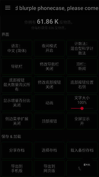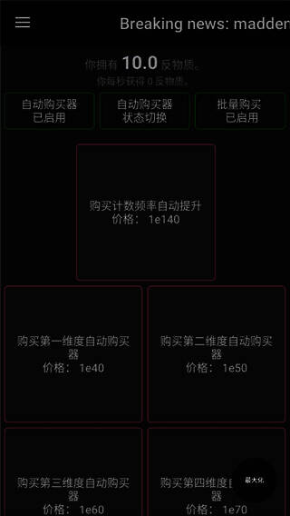 5、游戏具备较强的离线进度(所有维度会继续产生低阶维度并获得反物质),不过离线时无法进行购买操作,离线时间通常只能让玩家推进到下一次提升或星系阶段。