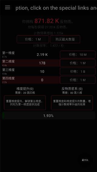 2、玩家可通过建立最高维度的计数,进行维度转移(解锁更高维度,最高到第8维度)、维度提升(使所有维度的乘数翻倍),最后还能开启反物质星系(1个星系使Tickspeed减速增加0.1x - 1.12x,2个星系使Tickspeed减速增加1.13x,生产乘数分别约为1.136x和1.149x)。