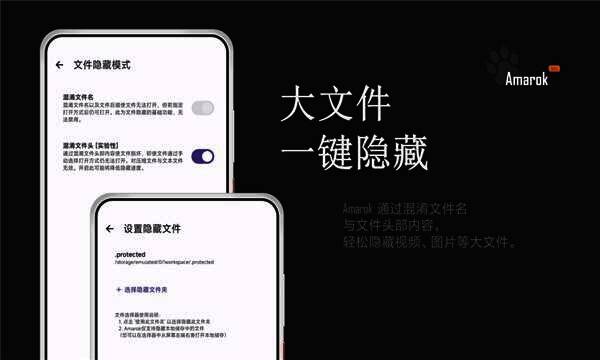 Amarok隐藏神器带来全新文件隐藏功能,通过混淆文件名和签名轻松隐藏应用和文件,还支持一键隐藏多个不同文件夹,为手机使用带来便利。