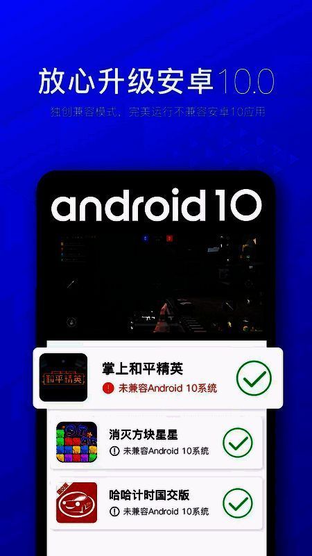 3. 具备安心升级和兼容模式,可让与 Android 10 不兼容的应用程序流畅运行,能在 Android 10 手机上完美运行和平精英、办公应用、单人游戏等。