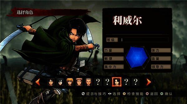 游戏有十位角色供玩家使用,分别是艾伦、三笠、阿尔敏、克里斯塔、莎夏、柯尼、让、利威尔、韩吉、埃尔文。并非所有角色开局解锁,未达特定剧情无法使用未解锁角色。