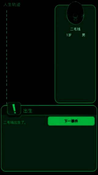 1、游戏画面采用深色背景搭配绿白字体,十分简约,且没有任务系统,只有各种人生阶段供玩家选择。