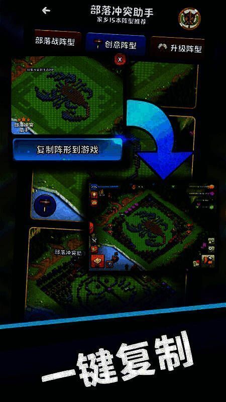 1. 打开coc部落冲突助手,在首页点击下方复制阵型图标(如箭头方向所示)。