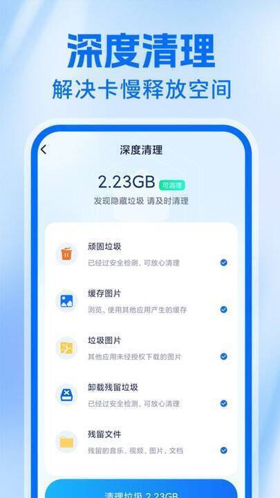 清理神速大师软件能对手机系统展开全面扫描,精准检测并清理各类垃圾文件。通过深度扫描,可揪出藏在系统深处、大量占用存储空间的垃圾,为用户释放更多空间。它还能针对各应用程序清理缓存,释放空间的同时提高应用运行速度,且能实时监测手机内存,内存占用过高时自动优化。