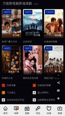 软件不断更新最新影视剧内容,同步更新无缺剧现象。拥有大量高清影视节目,用户可根据上网速度自由选择多种画质,全网影视节目应有尽有,打造聚合免费电视平台。
