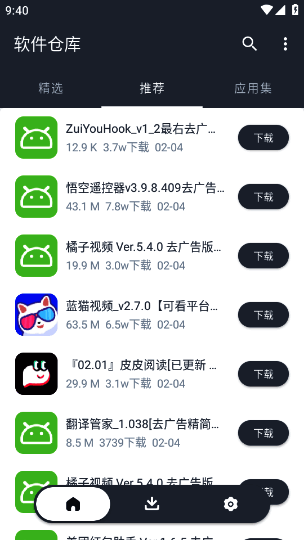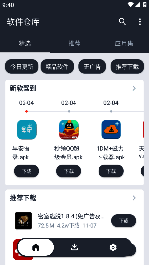 下载本站提供的软件仓库 App 并安装打开,进入首页,首页有精选、推荐和应用集板块。【精选】集合今日更新、无广告和精品应用;【推荐】汇聚各类型精品软件;【应用集】包含丰富应用合集,点击即可下载应用。用户也可通过顶部搜索框输入关键词搜索应用。