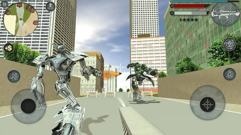 2、机器人战斗:除飞行外,玩家能切换至机器人形态,开展地面战斗,击败敌人,保卫城市。