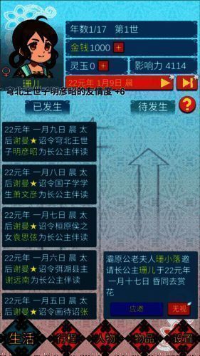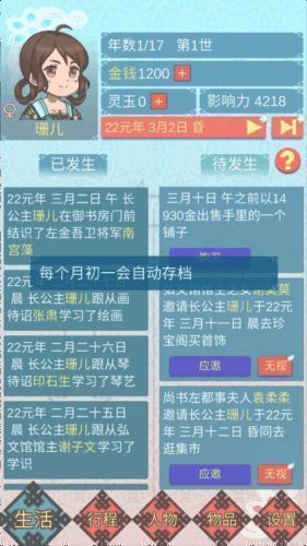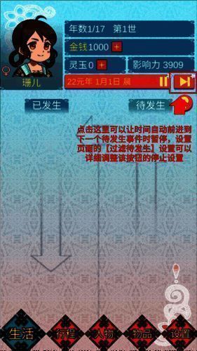 5. 自动开始剧情故事,左侧显示已发生事件,右侧为待发生随机事件,玩家自由选择,不同选择影响未来命运。