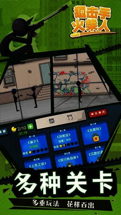 游戏带来精准射击体验,玩家要细致瞄准并计算风速、距离等因素,完成高难度狙击任务。它有丰富的任务类型和敌人种类,每个任务情节和目标各异,考验玩家策略与反应能力。精美的火柴人画风,画面简洁且不失细节,让玩家在战斗中享受视觉盛宴。还有多种武器和装备供玩家依任务需求选择,丰富的关卡设计让每一关都充满挑战与新鲜感。