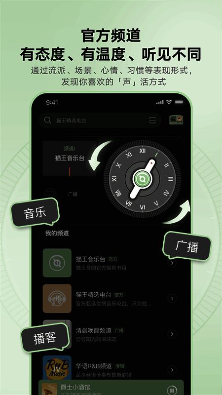 猫王妙播Pro官网版带来了富有广播文化底蕴的创新收听体验。在这里,无论你是在学习、工作还是放松,不管喜欢古典音乐、爵士还是嘻哈,都能将兴趣融入频道。听到心仪音乐可轻松收藏到「频道」,打造专属私人歌单,不错过每一首邂逅的好歌。只要在APP“频道”注入喜爱的音乐,打开猫王音响设备就能畅享好音乐。