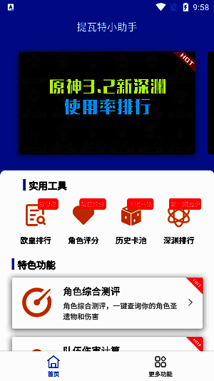 查看角色伤害评定等级,在“更多功能”页面选“圣遗物/伤害排行”。