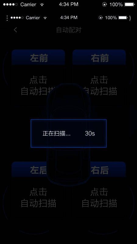 3、自动配对:安装好胎压后,在自动配对界面,点击任意胎压,APP 会在 60 秒内搜索周边胎压发出的匹配蓝牙信号完成配对。