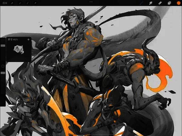 1. 打开procreate软件,分图层绘制后,若要翻转部分内容,点击右上角【图层】,选择需反转的图层,再点击左上角箭头图标,画布下方出现工具栏,【水平翻转】交换图案左右两边,【垂直翻转】交换上下两边,除【旋转45度】外,点击图案上边绿色小点拖动可调整旋转角度。