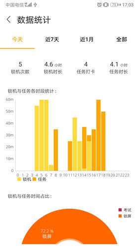 日常任务方面,可自定义待完成、已完成和需打卡的任务;数据统计能自动统计锁机数量、锁机时长、任务计时等信息,并以图表呈现今日、近7天、近1个月及全部的情况;时间流日历会自动记录每日锁定时间和时长并逐一列出。