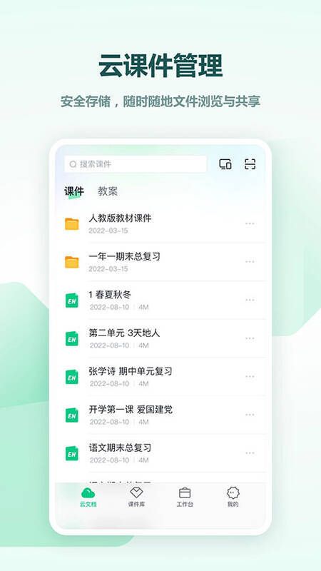 - 用户可获免费云空间用于上传/存储/获取课件。