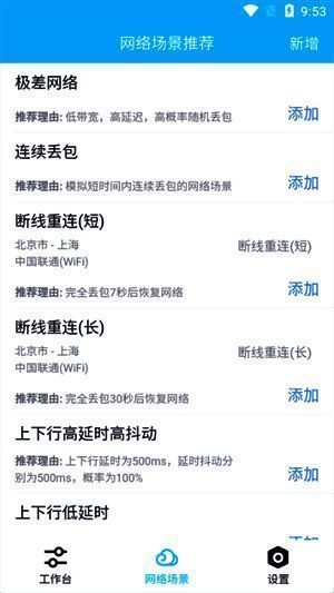 4、【网络场景】界面有许多常用网络场景,选择所需场景点击【添加】按钮,进入所选网络场景各参数的详细数据设置界面。