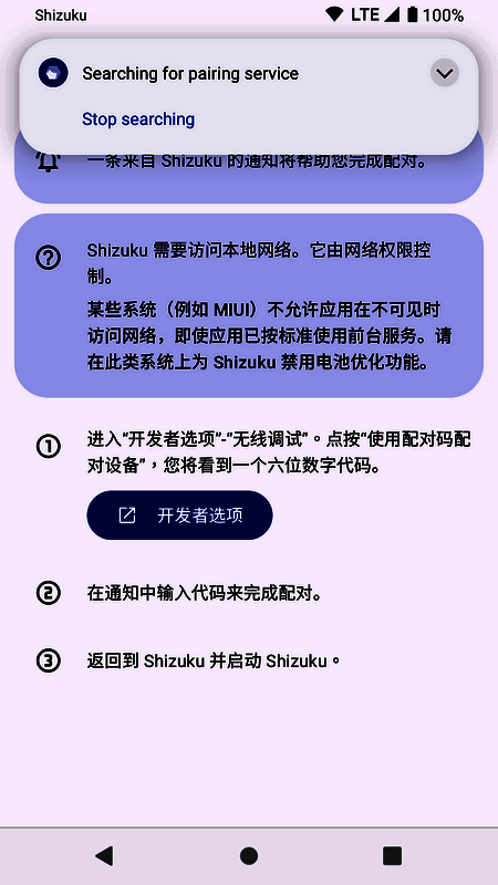 1、连好WIFI,打开Shizuku,点开配对,要求通知那就点击打开。