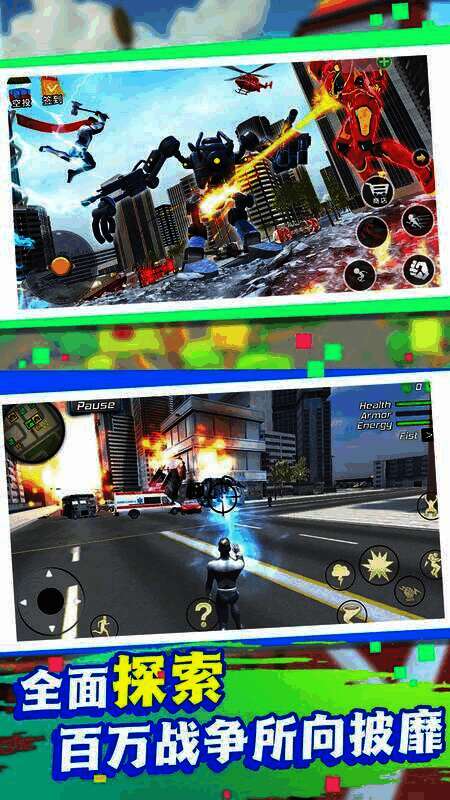 机甲种类丰富,玩家可挑选喜欢的盔甲助力冒险。城市中敌人众多,需使出最强攻击提升实力。还能像钢铁侠一样飞向天空,操控最强机甲战斗,音效模拟十分逼真。