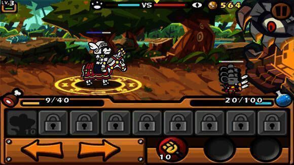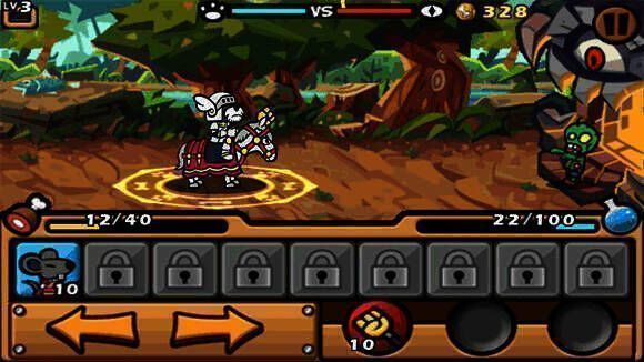 5、正式开始后,下方是可召唤的兵种,箭头可控制角色移动,右下方按钮是角色技能,使用消耗魔力,魔力用蓝色瓶子显示。