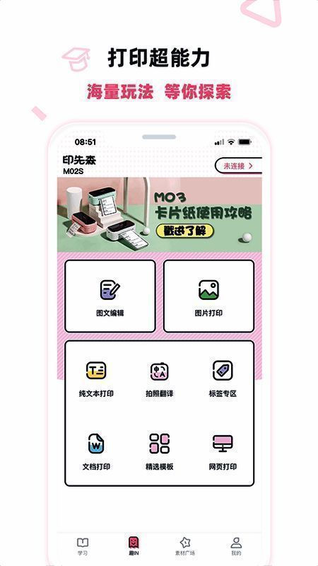 印先森官网版堪称极为便捷的学习办公利器。该软件支持多种文件打印,像打印图片、错题、阅读资料、网页等功能一应俱全,无疑是学生党的福音。学生无需再手抄错题,直接拍照打印后粘贴到笔记本,节省做题时间,大幅提升学习效率。而且打印出的文档可自由编辑,能插入文字、图片、表情、表格和二维码,还能随心打印喜欢的图片,如美图、爱豆照片、临摹字帖、表情包等。它采用热敏打印技术,无需网络连接,电池续航久。搭配印先森官网版 app 丰富的打印样式,能充分满足用户打印需求。感兴趣的朋友别错过下载。