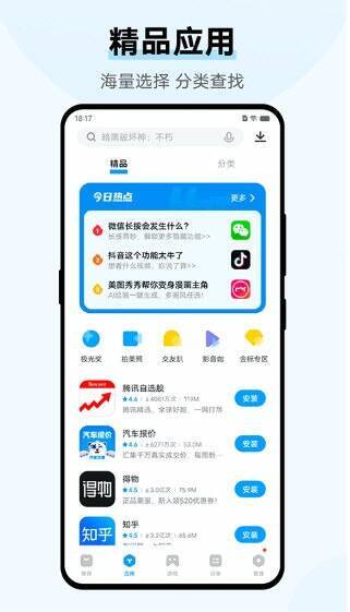 它提供快速稳定的下载渠道,方便用户轻松下载和安装应用。同时,会及时推送应用更新通知,便于用户升级到最新版本,获得更佳功能与体验。此外,还具备应用程序管理功能,用户可轻松查看已安装应用列表,进行卸载、备份和更新管理,有效释放手机存储空间。