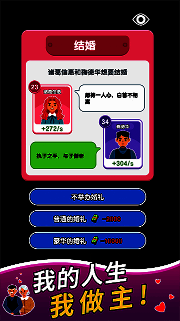 1、纸牌决策:融合策略、运气和决策元素,玩家通过抽牌做出决策。每张卡片代表不同的生活事件或选择,影响角色发展方向。