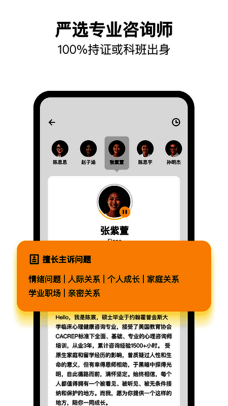 1、平台咨询师均经过认证或培训(临床和咨询心理学专业),接诊前要历经简历、笔试、视频面试、案例模拟面试、在线咨询培训五层筛选。
