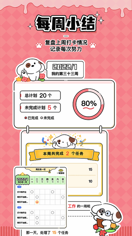 4、可创建多个计划,开启周计划部署时能云端养宠,创建计划即可领养小狗。完成计划列表任务并打卡成功,可领取狗粮。随着时间推移,狗狗的饱腹、清洁和健康会下降,要让狗狗健康成长,需及时打卡完成计划。