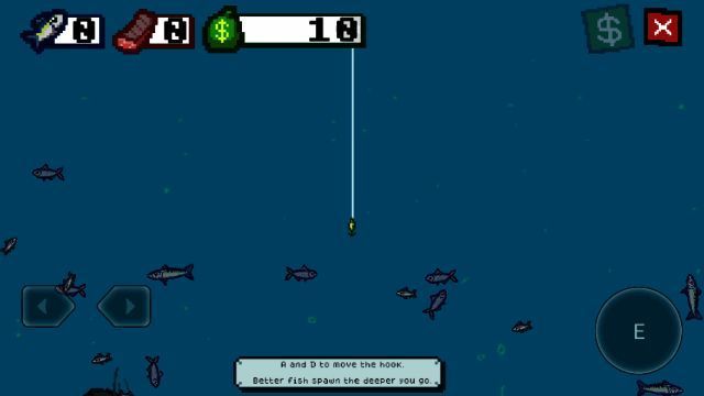 2、前往最左边钓鱼台,点击“E”开始钓鱼。钓鱼线自动下降,用左右方向键控制方向,用鱼钩撞击鱼造成伤害,伤害足够后将鱼钓起。