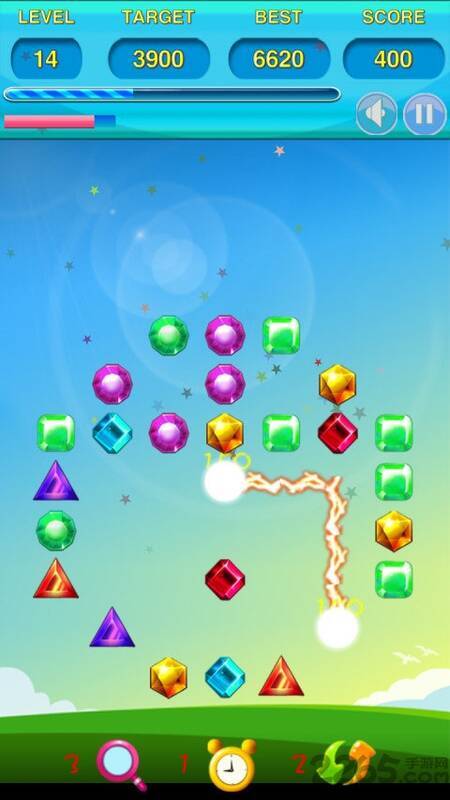 1、玩家要在限定时间或步数内,通过连线相同颜色宝石消除它们,达成关卡目标。