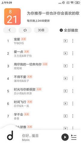 魔音Morin官网正版是一款免费的音乐收听与下载软件。它拥有高清简约的界面、丰富的音乐资源和庞大的音乐库,有各类音乐播放列表,能让你轻松找到想听的内容。软件提供不同主题背景供切换,可从新歌发布和权威榜单中挑选,还能免费下载,让你随时随地畅听音乐。你还能一键与朋友分享动听歌曲,借助备受好评的音乐播放器和智能推荐的音乐会,依据自己喜欢的音乐风格筛选。