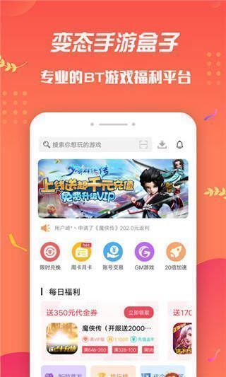 变态手游盒子官方正版是一款出色的福利手游下载平台。该app为用户提供海量游戏资源,涵盖各类游戏,能满足多样需求。其显著特点是汇聚大量异常游戏资源,无需充值就能免费获取VIP、锭、体验等,还有如手机游戏BT服务器、公益服务器、破解版、独家定制版等永久免费资源,且均在官方版本基础上修改,无删减,带来极致游戏体验。