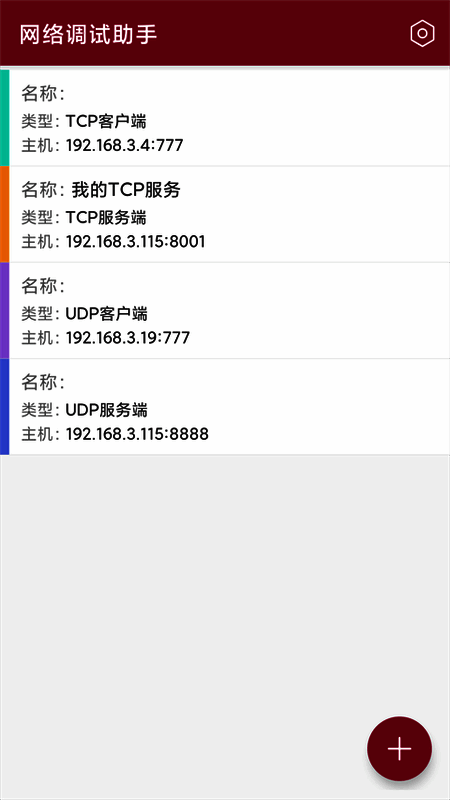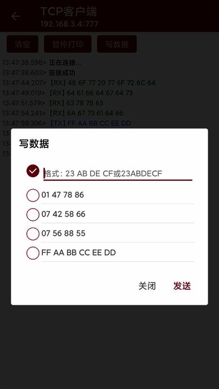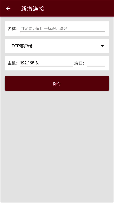 IP输入框和端口输入框用于输入目的地的IP,右侧按钮为连接/断开(服务器模式下为打开/关闭),用于操作是否建立连接。
