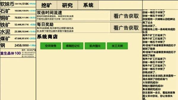 1、《重生挖矿》的核心玩法围绕资源获取与管理。玩家点击屏幕上的“挖矿”按钮模拟开采,获取基础矿石资源,这是游戏发展的起点,为后续科技研发和设施建造提供材料。