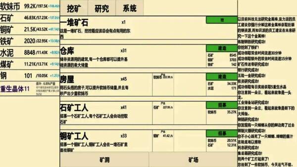 《重生挖矿》是一款文字类型的经营模拟游戏。玩家进入游戏后,首先看到的是一排排文字,可别小瞧这些文字,它们是玩家在游戏中立足的基石。玩家通过文字提示,收集石矿、铜矿、铁矿等不同矿石,用矿石换取资源,进而建造仓库和房屋、雇佣工人、购买并升级挖矿器械。多余资源还能用于研究新内容、建造更多设施,逐步成为游戏里的大“财主”。