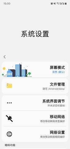 6. 高级系统设置:涵盖屏幕模式、系统文件管理读/写/Android/data/、系统界面调整、移动网络模式、移动网络频段、密码功能。