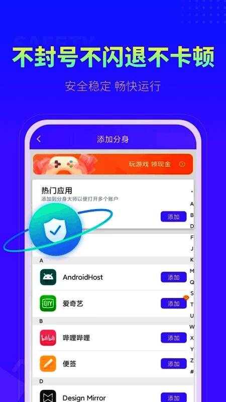分身大师是一款支持一部手机同时登录两个账号的黑科技产品,在主页面点击添加,选取要分身的应用,添加完成以后,登录第二个账号,您就可以享受两个账号同时在线的乐趣了。