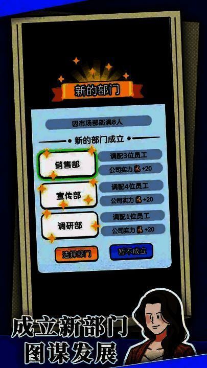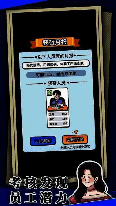 董事长模拟器手机版下载是一款休闲模拟经营类游戏。在游戏中,玩家将以初创者的身份开启属于自己的商业篇章,亲手打造并运营一家公司。随着公司业务的逐步拓展,员工队伍的不断壮大,你将面临各种挑战与机遇。通过精心设计的考核机制,你能够深入了解每一位员工的工作表现和潜力。对于那些展现出卓越能力和无限潜力的员工,适时地为他们增加工资,不仅能激励他们为公司创造更大的价值,还能提升团队的凝聚力和战斗力。