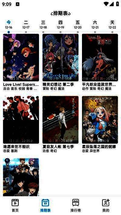 4、在排期表页面,可以查看每周每天的番剧排期。