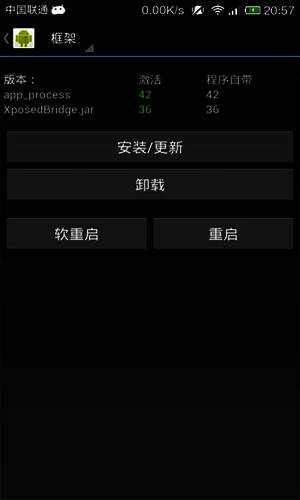 3、主要有核心框架、应用模块、下载模块三个功能。首次安装后,需进入核心框架安装更新,保证运行在最新版。点击“安装/更新”,授权root权限后重启手机。