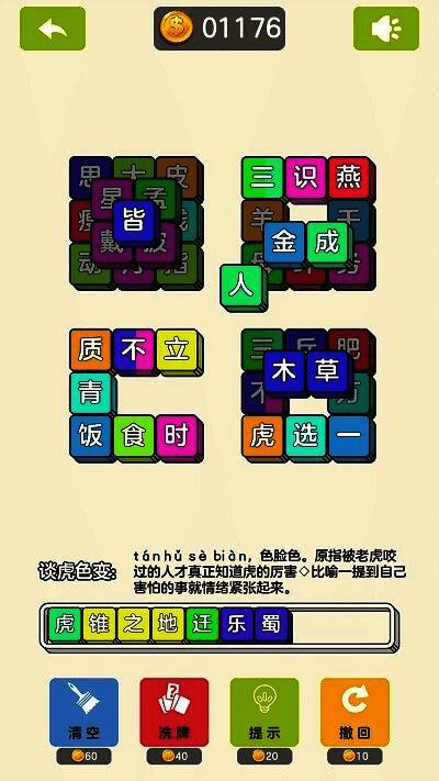 《成了个语》是一款趣味十足且富有挑战的文字益智游戏。玩家需点击并组合文字,组成正确成语以完成关卡。它不仅考验语言能力与知识储备,还需灵活思维与策略。