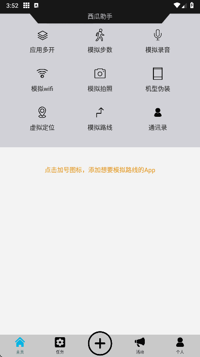 西瓜助手虚拟位置软件是一款实用的虚拟定位模拟工具,它集多种强大功能于一身,涵盖多应用开启、模拟摄影、模型伪装、模拟步数、模拟wifi、模拟录音、虚拟定位、模拟路线等。软件界面简洁无广告,操作简便且免费使用,能满足不同用户多样需求。它支持本地所有应用,游戏双开稳定快捷又安全,还能一键机型伪装保护隐私。