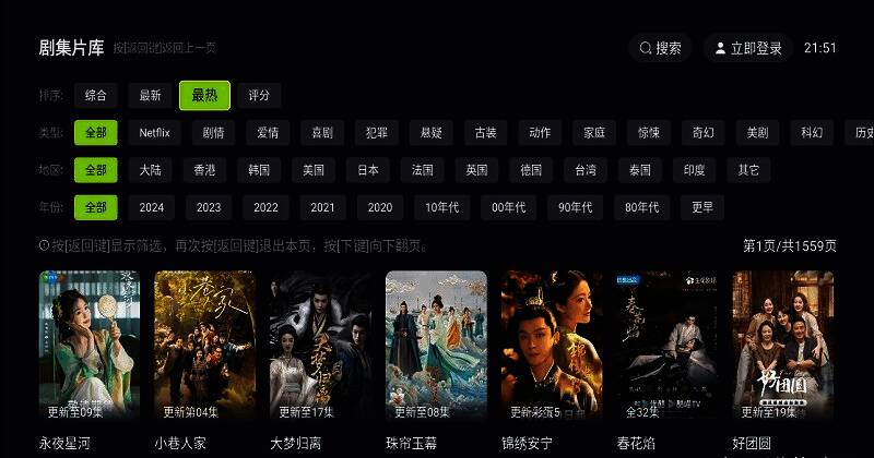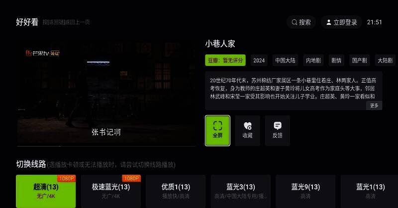 好好看电视端 app 是一款完全免费的影视剧观看软件。它为用户整合了海量优质影视资源,涵盖电影、电视剧、动漫、综艺节目等各类影视内容。软件内置高清线路,实时更新最新剧集,同步全网资源,让用户第一时间观看到最新影视。同时,它着力打造无广告的观看环境,让用户沉浸剧情,享受观影乐趣。