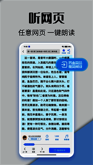 其优势明显,既支持听有声小说,也能阅读原著内容,可搜索小说或作家。亮点颇多,听书时能解放双眼,有20个AI主播可选,网页点击即可收听,还有18种优质背景音。有需要的小伙伴快来下载体验!