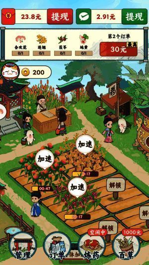 在游戏中,玩家需要根据客户的订单种植相应的草药,并通过浇水、施肥等操作确保作物健康成长。完成订单后不仅可以获得基础奖励,还能触发红包机制,赢得额外收益。地图上会随机出现各种人物角色,与其互动可触发特殊事件,有时还能直接获取所需草药。这种融合了订单系统与事件系统的玩法设计,不仅提升了游戏的趣味性,也增强了玩家的参与感。