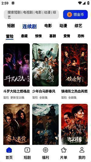 1、首页顶部栏设有众多影视分类,如电视剧、电影、综艺等;