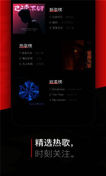 3. 流行歌曲排行榜可收听感兴趣的歌曲,实时更新推送新播放列表。