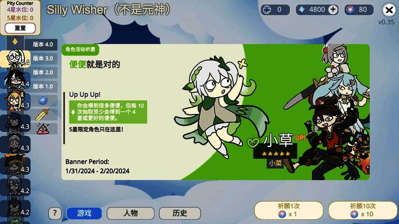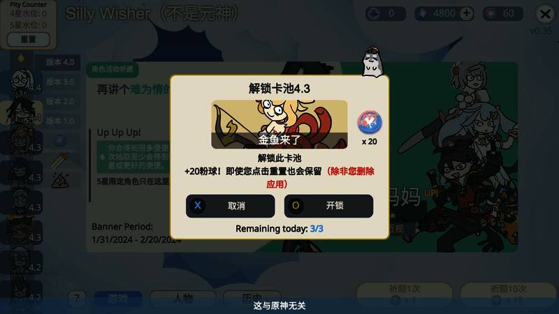 silly wisher安装包中文版是一款极易上手的原神抽卡模拟游戏。它玩法与模式自由,玩家能随心开展抽卡挑战,自由收集原神角色、武器等,感受刺激战斗冒险。游戏有无限原石,可尽享抽卡乐趣,轻松拿奖励。
