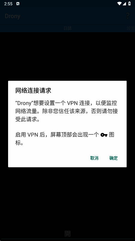 6、左滑到log标签页,点击底部到off按钮,启用drony,同时确保drony进程在后台不会被杀掉。