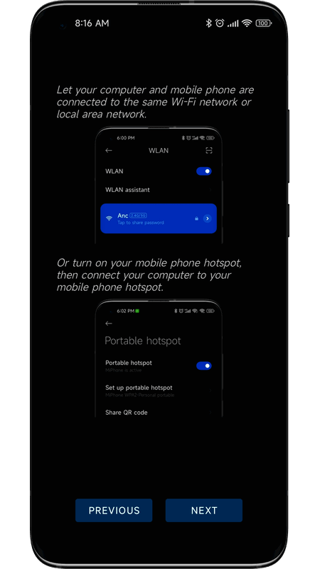 2、如图,手机和电脑需要处于同一网络。可以让手机分享热点给电脑连接,也可以让电脑连接局域网内的路由器来实现连接。